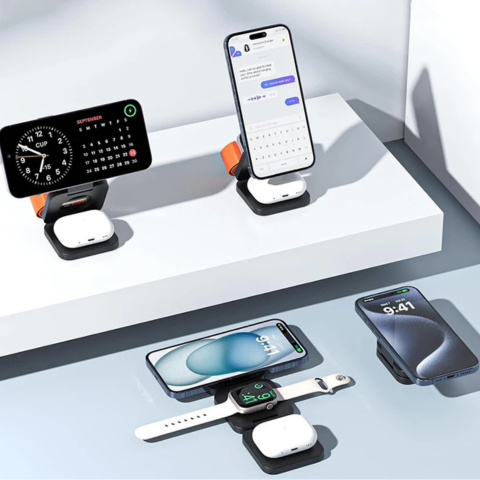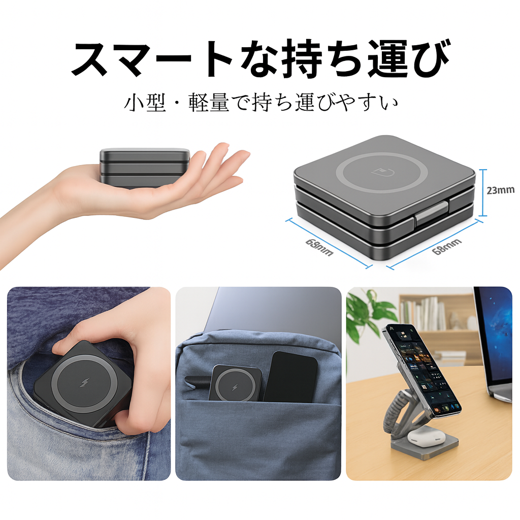 MagSafe対応のワイヤレス充電ステーションは、最大3台のデバイスを同時に効率よく充電できます。 折りたたみ式なので持ち運びや収納も簡単。 スマートで場所を取らず、デスクや旅先での充電を快適にサポートします。 安定した充電性能で、毎日の充電をより便利に。 手軽にデバイスを一括管理したい方に最適なアイテムです。